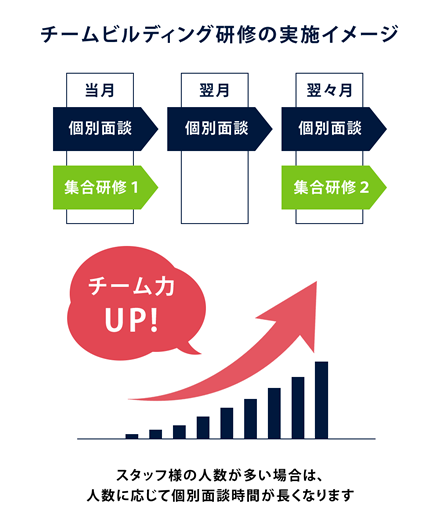 弊社では、クリニック全体研修と個別スタッフ面接の2本の柱でONE TEAM作りのサポートをいたします。